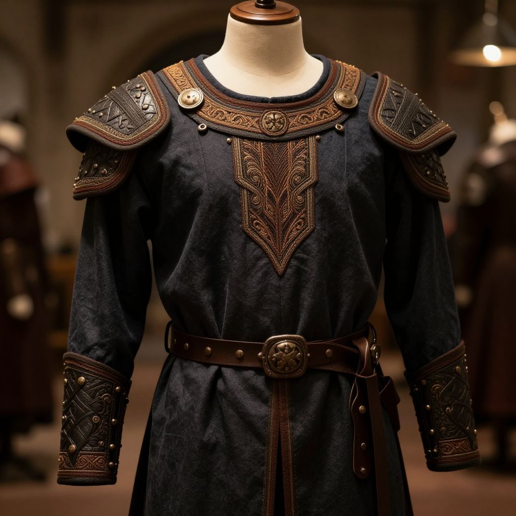 Battle tunic displayed on a mannequin in a fantasy armory, intricate embroidery and reinforced shoulder pads, soft ambient light highlighting textures, realistic style