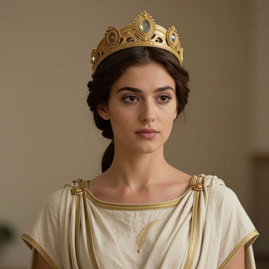 Photograph of a young woman with fair skin, dark brown eyes, and dark brown hair styled in a loose braid. She wears a detailed gold crown with intricate designs and a large green gemstone at the center. Her attire is a cream-colored, ancient Roman-style tunic with gold trim and shoulder straps. The background is softly blurred, featuring neutral tones and a hint of a potted plant on the left. She has a serene, slightly melancholic expression, and her makeup is natural with a focus on her eyes. The image has a timeless, classical aesthetic.