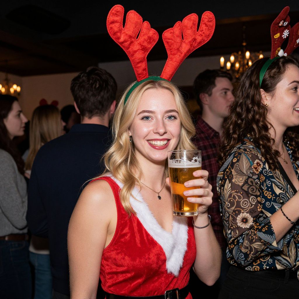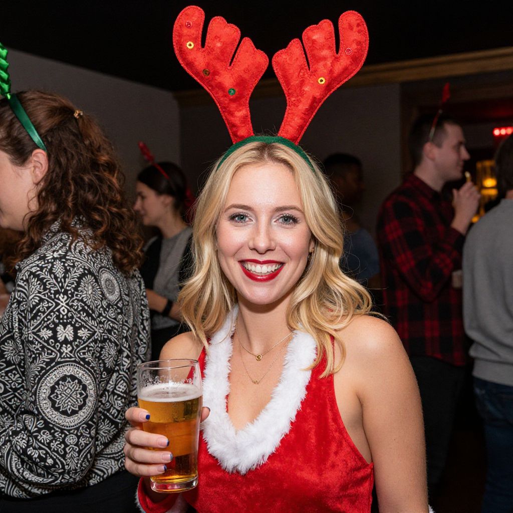 Photograph of a smiling blonde woman with fair skin and blue eyes, wearing a festive red velvet dress with white fur trim, and red, glittery reindeer antler headband. She holds a glass of amber beer with a straw in her right hand. Her red lipstick matches her dress. In the background, a dimly lit bar with several people, including a woman in a black and white patterned sweater and a man in a red plaid shirt. The setting is lively and festive, with warm, yellow lights in the background. The overall atmosphere is cheerful and social.
