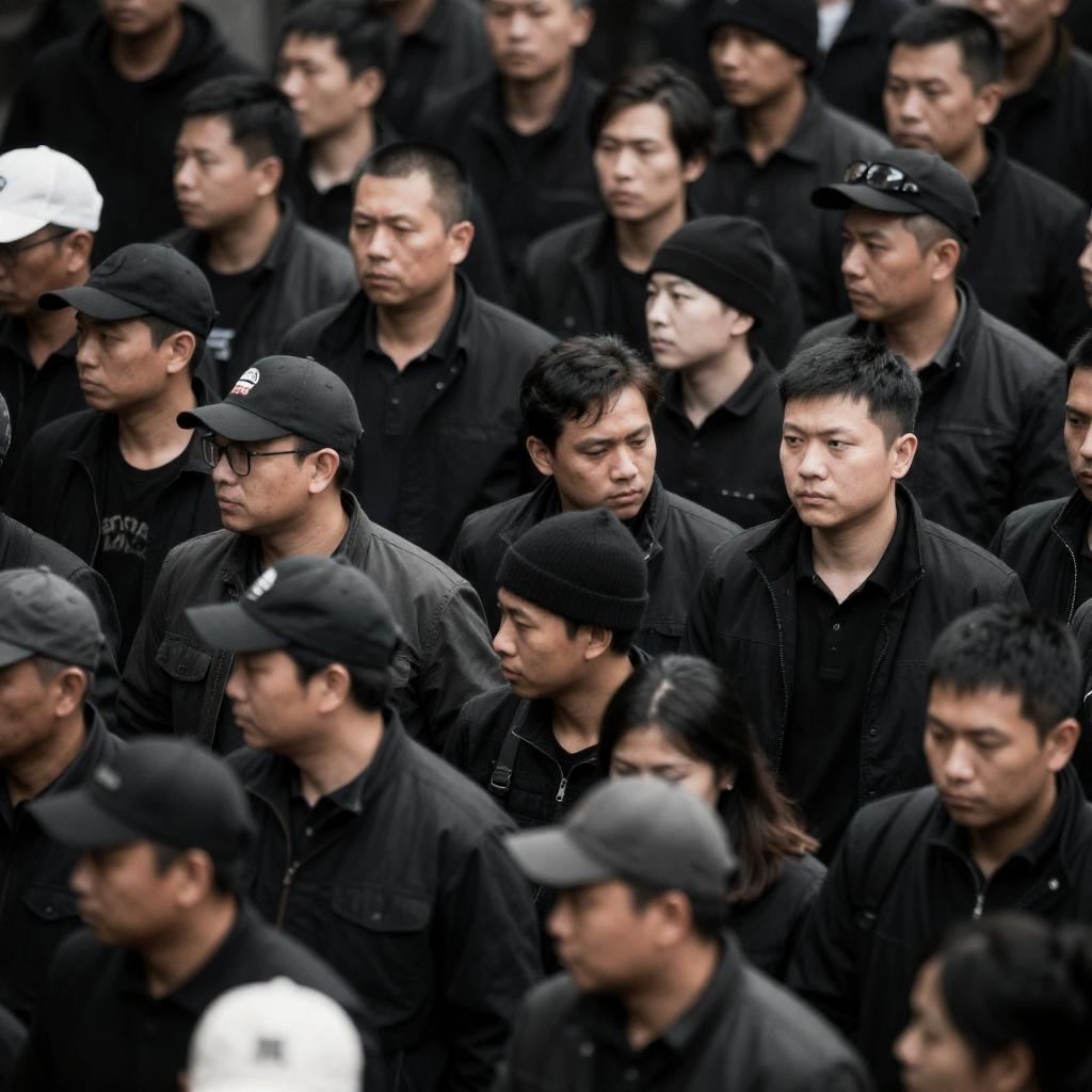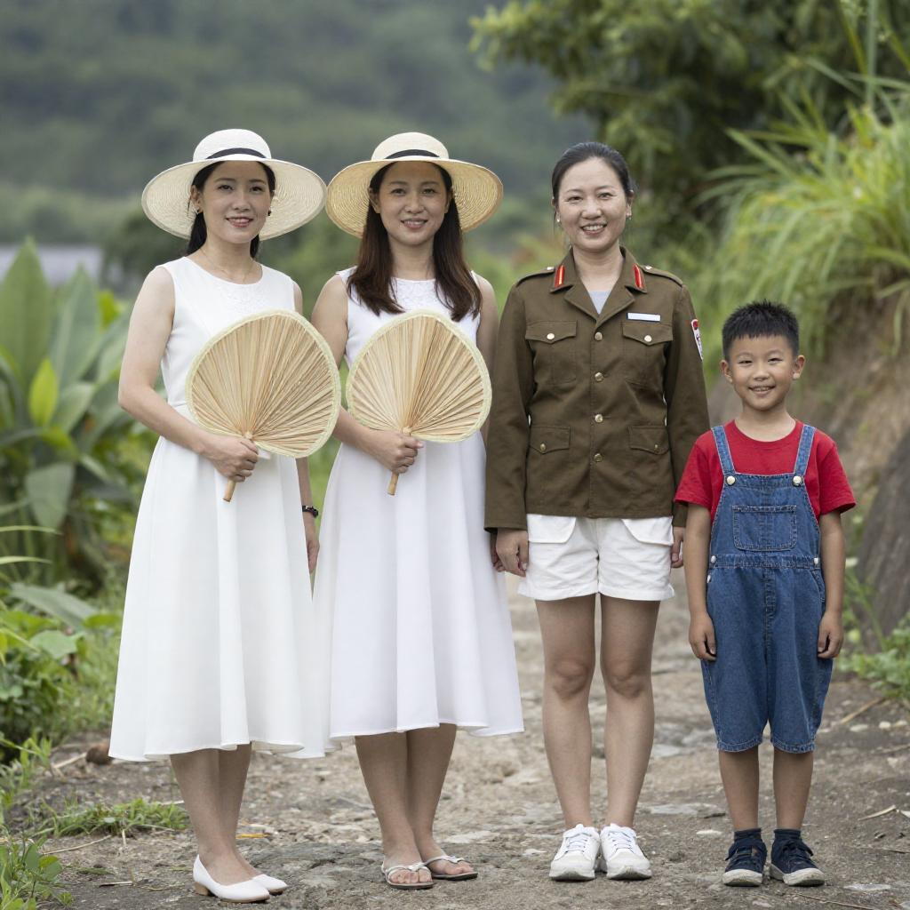 Photograph of a diverse group of people standing closely together, wearing traditional Asian clothing with straw hats, gloves, and scarves. They have varied expressions, some smiling, others covering their mouths. The background is blurred, focusing on the group's colorful attire and close-knit formation.