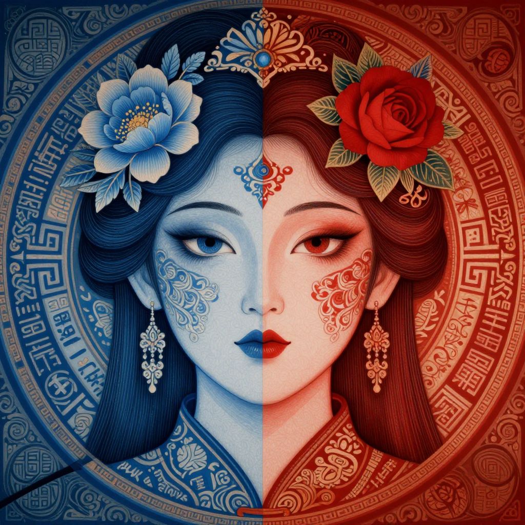 The image presents a striking visual composition featuring two halves of a woman's face, each half adorned with intricate patterns and vibrant colors. The left side of the face is bathed in a cool, blue hue, with delicate floral motifs and a prominent blue flower adorning her hair. The right side of the face is rendered in warm, red tones, complemented by a red rose and ornate designs. The two halves are symmetrically arranged, creating a balanced and harmonious visual effect. Surrounding the faces are circular patterns filled with various characters and symbols, adding depth and complexity to the composition. The overall design is reminiscent of traditional Chinese art, with its rich color palette and detailed, ornate patterns. The interplay of colors and textures, along with the intricate designs, creates a visually captivating and dynamic image.
