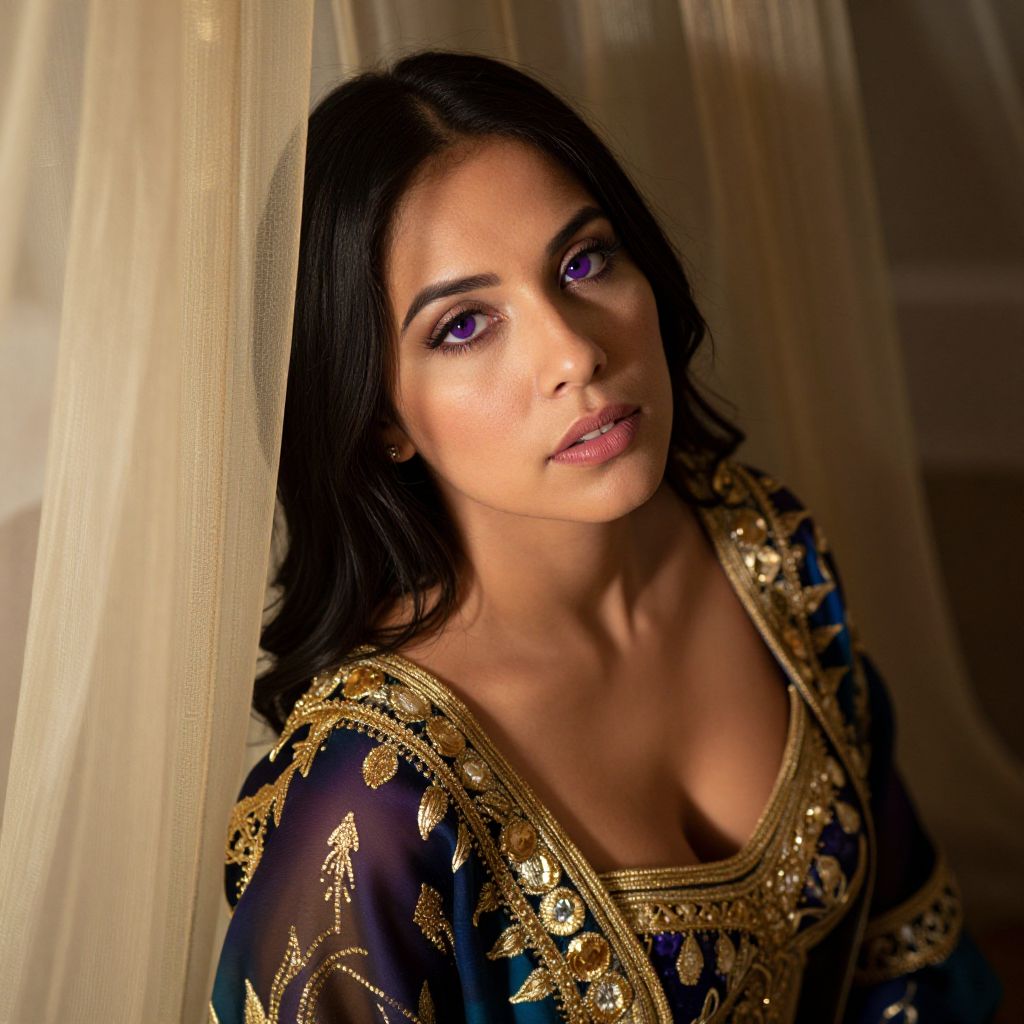 Envision a hyperrealistic portrait of a Latin American woman exuding allure with her striking violet eyes and raven hair. Adorned in an intricate harem-inspired outfit with gold embroidery, she is captured from an unusual high angle that enhances her ethereal beauty. The delicate balance between exotic elegance and deep introspection shines through as she gazes thoughtfully into the distance, her expression suggesting untold narratives. Soft golden sunlight filters through sheer curtains, casting gentle shadows on her smooth complexion while highlighting the luxurious textures of her vibrant attire. This captivating moment evokes an emotional gradient that reflects both intrigue and contemplation.