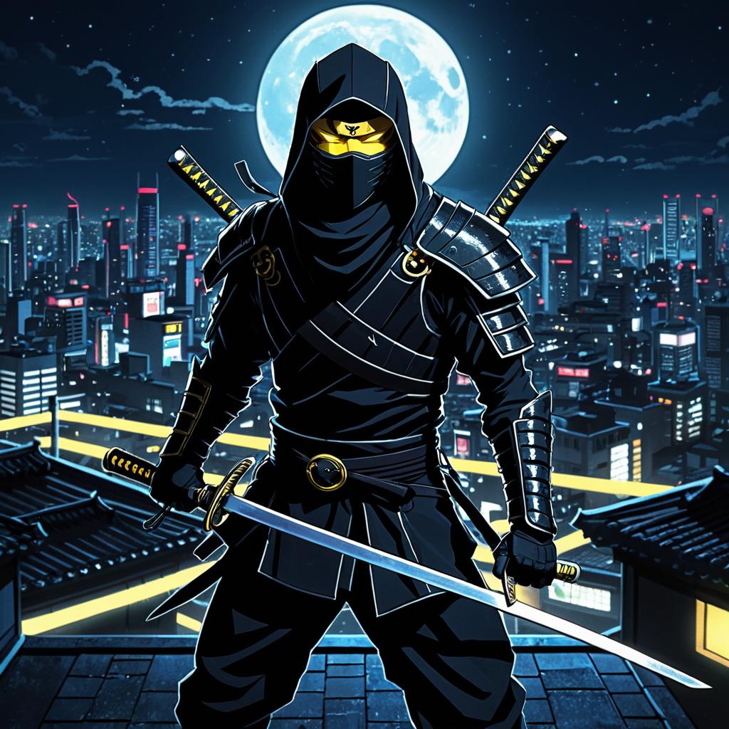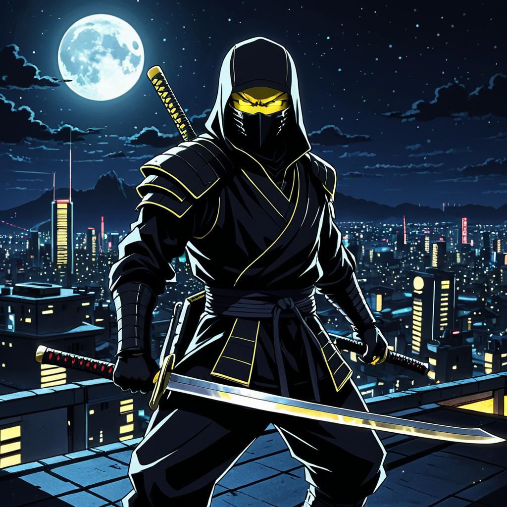A shadowy ninja, with sleek black armor and piercing yellow eyes, wielding twin katanas shimmering with dark energy, standing in a moonlit rooftop over a bustling neon city, illustrated in the dark and intense anime style of Go Nagai.