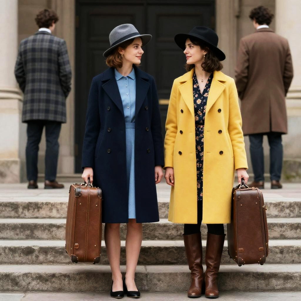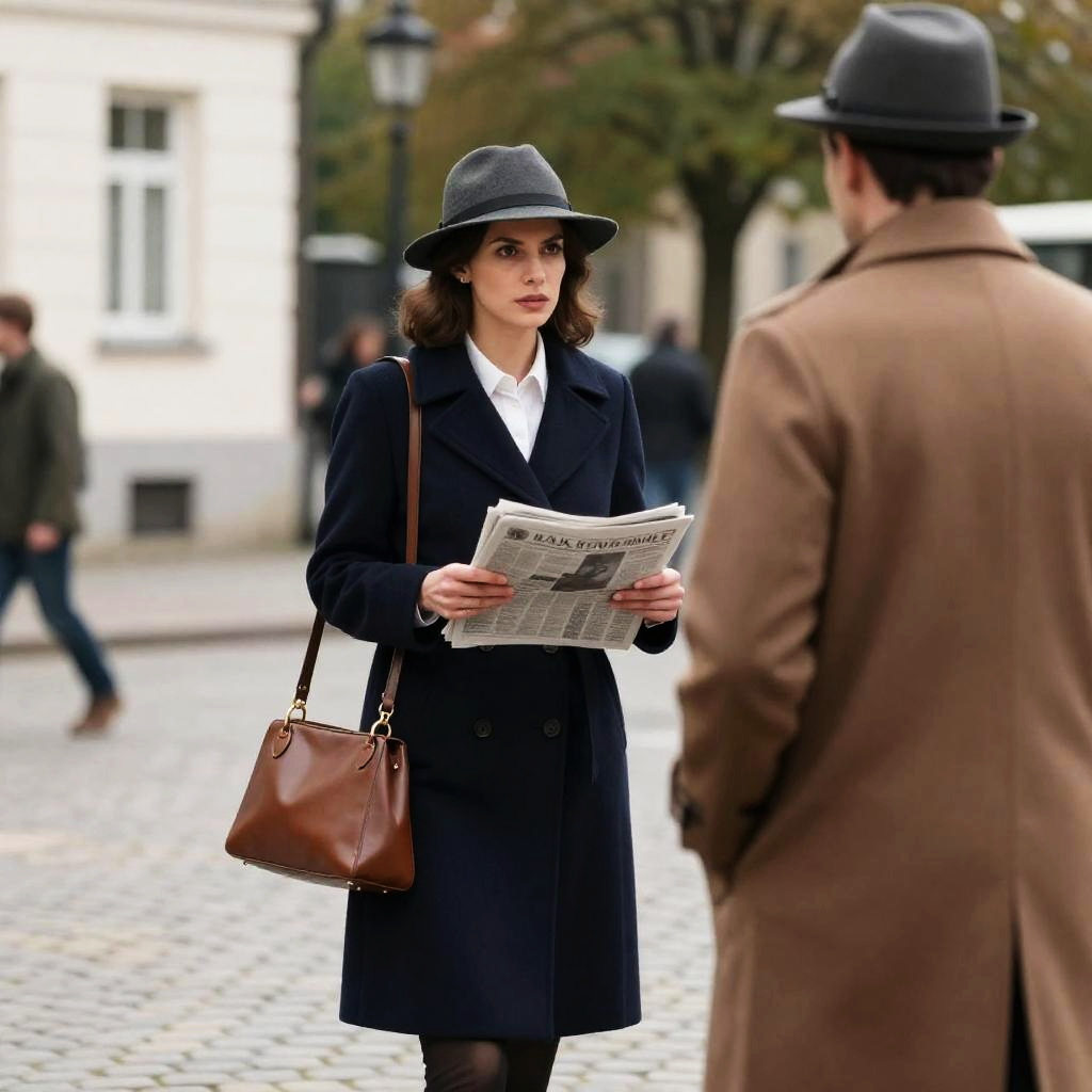 Photograph of a woman in a light blue dress walking on a wet, reflective bridge. The Houses of Parliament and Big Ben are in the background. She has dark hair and a neutral expression. A green lamppost is on the right. Overcast sky. She is in the foreground, slightly left of center.