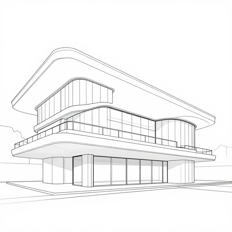Convert pictures to drawings, depicting an architectural photograph transformed into a clean, minimalistic digital line drawing, crisp edges with subtle shadows, futuristic and sleek design, emphasizing form and structure.