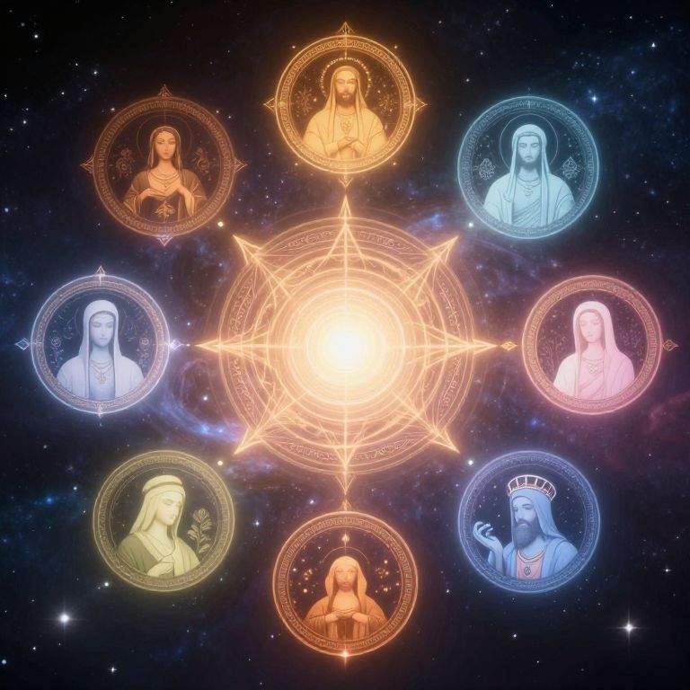 Religious symbols floating in a mystical cosmic background, glowing softly with ethereal light, representing unity of various faiths, intricate patterns blending geometry and nature, evoking a profound sense of spirituality and transcendence