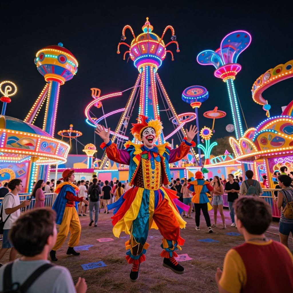 Photograph of a vibrant nighttime carnival, featuring a colorful clown in elaborate costume performing amidst glowing, neon-lit rides and a crowd of spectators.