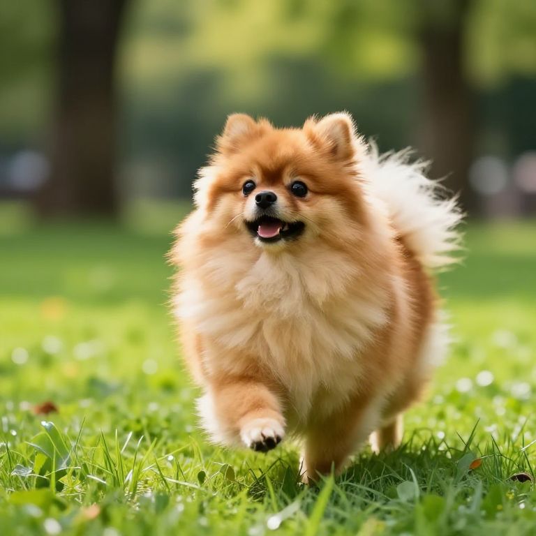 Photograph of a fluffy, caramel-colored Pomeranian puppy running joyfully on bright green grass, tongue out, in a sunlit park.