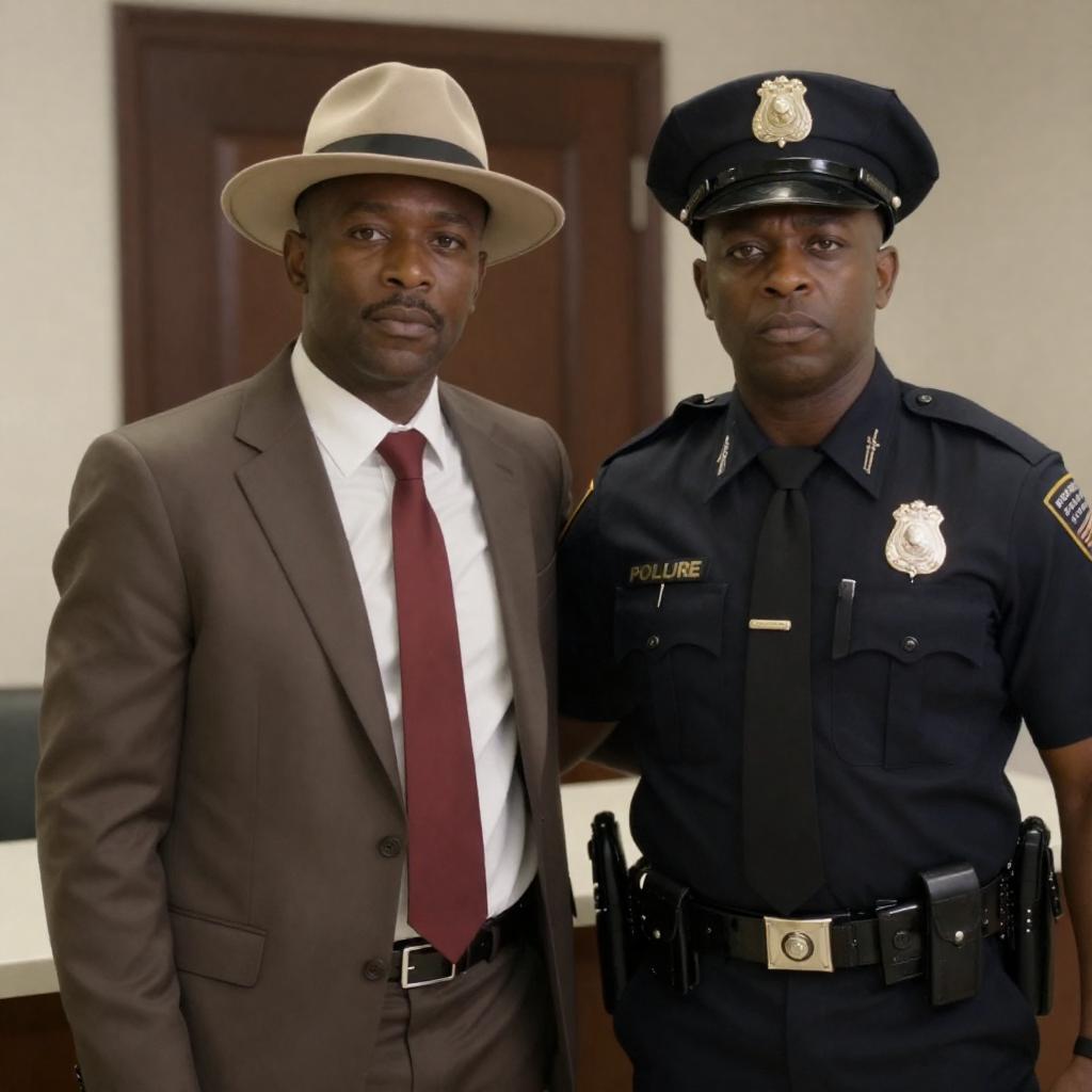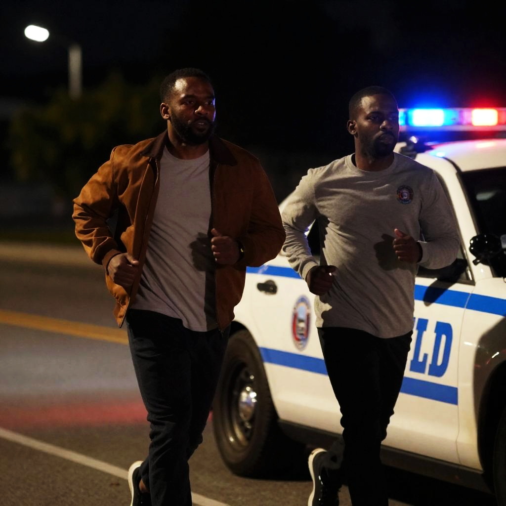Photograph of two Black men running away from a police car at night. One man in a brown jacket, the other in a gray shirt. Police car with red and blue lights. Background includes blurred streetlights and bushes. Both men have intense expressions. Police car has "NYPD" on the side.
