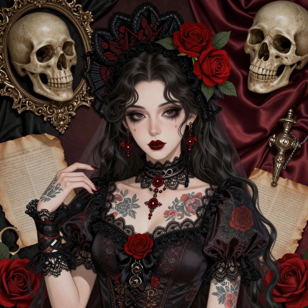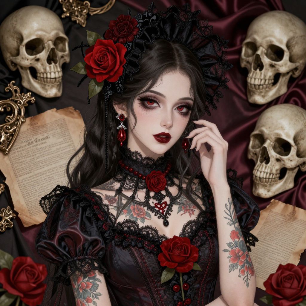 A digitally illustrated Victorian woman adorned in gothic dark art style, featuring intricate lace details, vibrant red roses, and tattooed floral patterns, set against a backdrop of ornate skulls and vintage satin paper print elements.