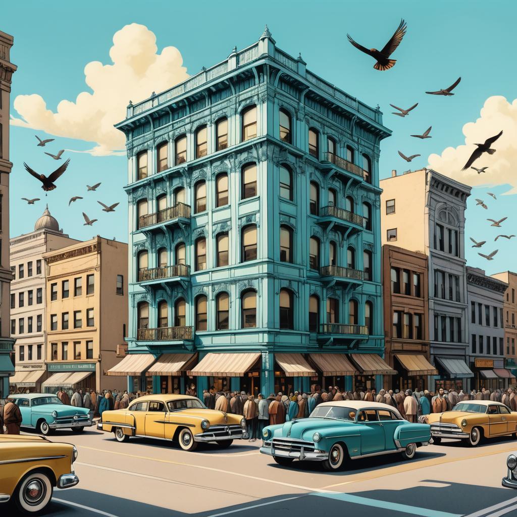 A bustling urban street scene featuring a vintage four-story building with ornate architectural details, crowds of people gathered outside, classic cars parked on the street, clear blue sky with birds flying, detailed linework and muted color palette reminiscent of vintage comic art, warm yellow and teal color tones, hand-drawn textures enhancing the nostalgic atmosphere