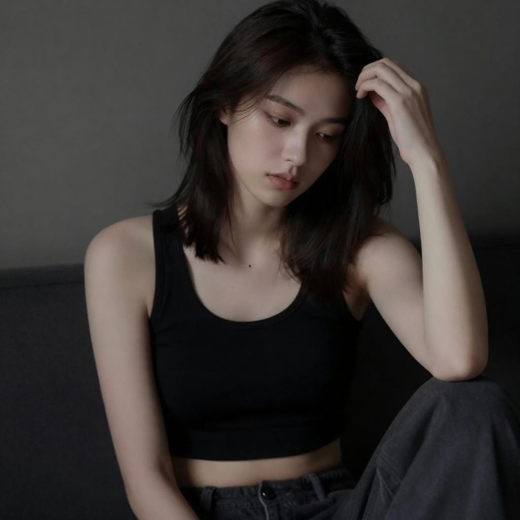 Photograph of a young woman with straight, dark brown hair and bangs, illuminated by a warm, orange light. She wears a black, lace-trimmed top with a low neckline, revealing a hint of cleavage. Her expression is serious, and she gazes to the right. The background is dark and blurred, emphasizing her illuminated face.