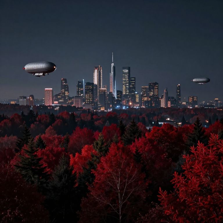 Photograph of a nighttime cityscape featuring a skyline illuminated by city lights. The skyscrapers, including a prominent, brightly-lit tower, stand against a dark blue sky. Two large, silver blimps hover in the sky to the left and right. The foreground showcases a dense forest with vibrant, red-tinged trees, contrasting with the dark silhouettes of the trees. The city lights create a bright, glowing effect against the dark sky and forest, highlighting the urban and natural elements in the scene.
