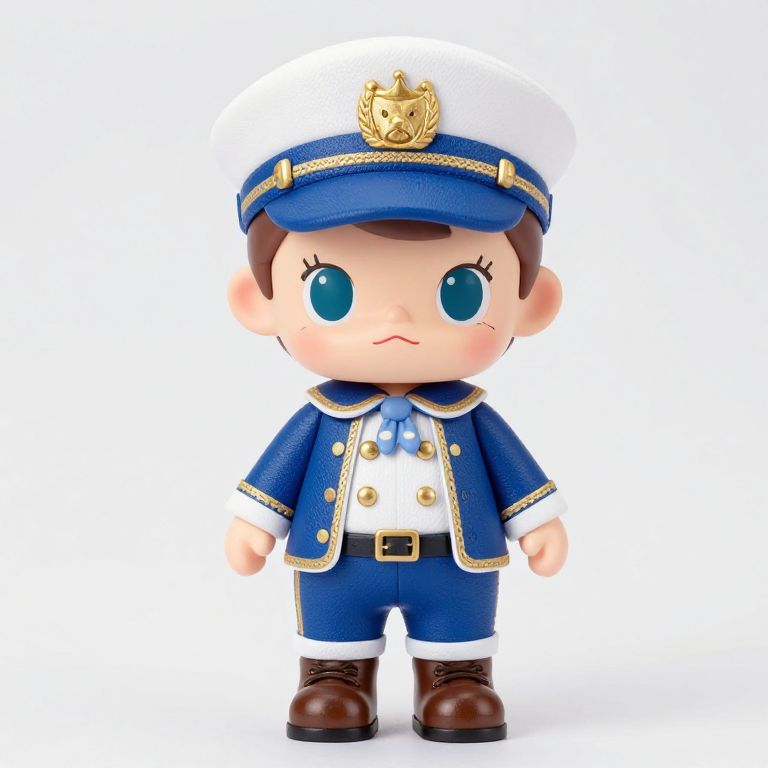 A doll with a blue outfit and a white hat with a gold emblem on it. The doll has brown shoes and is wearing a blue and white outfit with gold buttons.