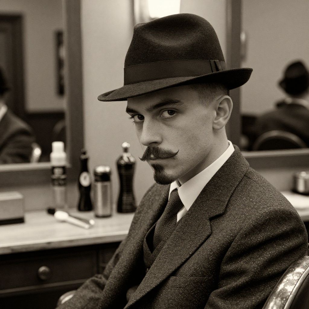 Stylish young man sporting a moustache goatee in a vintage 1920s setting, sepia tones, classic attire with a tailored suit and fedora, sharp focus on the hair style, classic barbershop tools and mirrors reflecting the mood, artistic film grain effect.