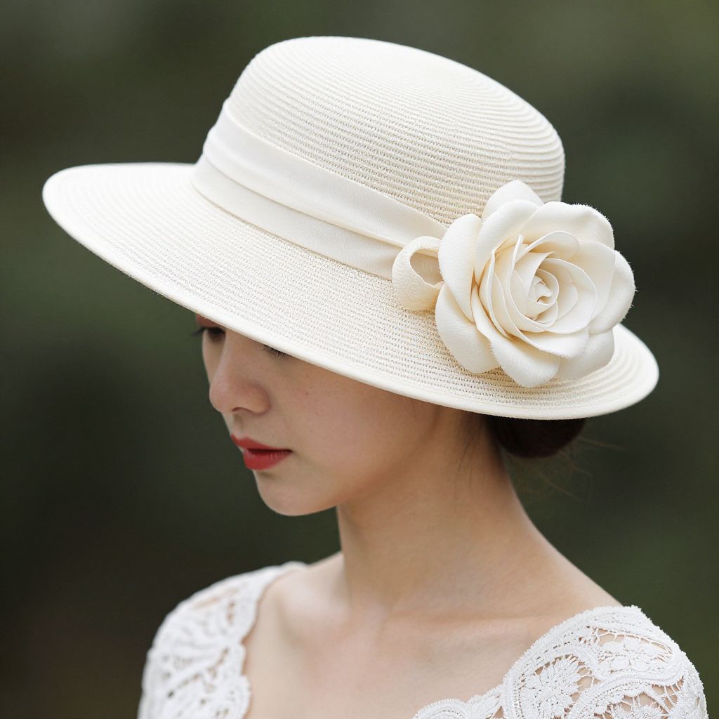 Woman modeling an elegant ivory sinnamay hat adorned with a large side silk rose, showcasing timeless bridal style by The Little Wedding Company.