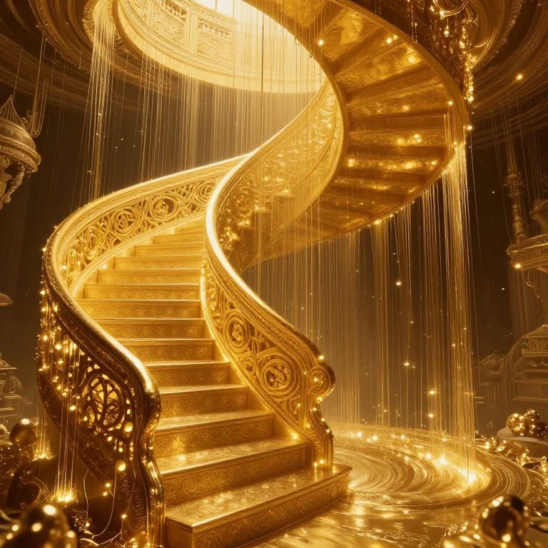This digital artwork depicts a grand, golden spiral staircase illuminated by radiant, warm light. The staircase, adorned with intricate, swirling patterns, ascends in a mesmerizing, spiraling motion. Glowing golden strings of light cascade from the ceiling, enhancing the opulence. The steps and banister are embellished with detailed, ornate designs, exuding luxury. The background is dimly lit, focusing attention on the luminous staircase. The overall scene is rich in texture and light, creating an ethereal, magical atmosphere reminiscent of a fairy-tale palace.