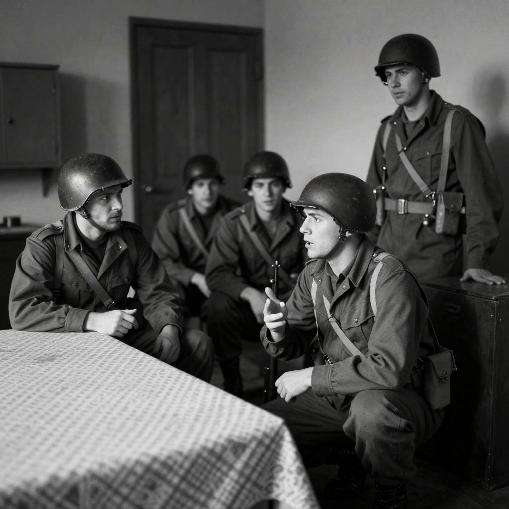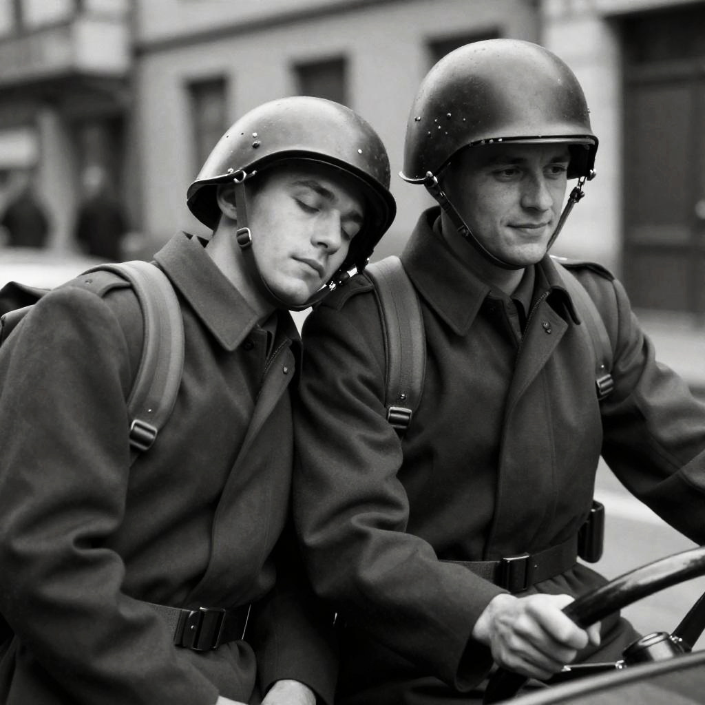Black-and-white photograph of two male soldiers. The soldier on the left, with closed eyes, leans on the shoulder of the soldier on the right, who is holding the steering wheel. Both wear military coats and helmets. Background shows a dimly lit street. Soldier on the right has a slight smile. Soldier on the left has a backpack.