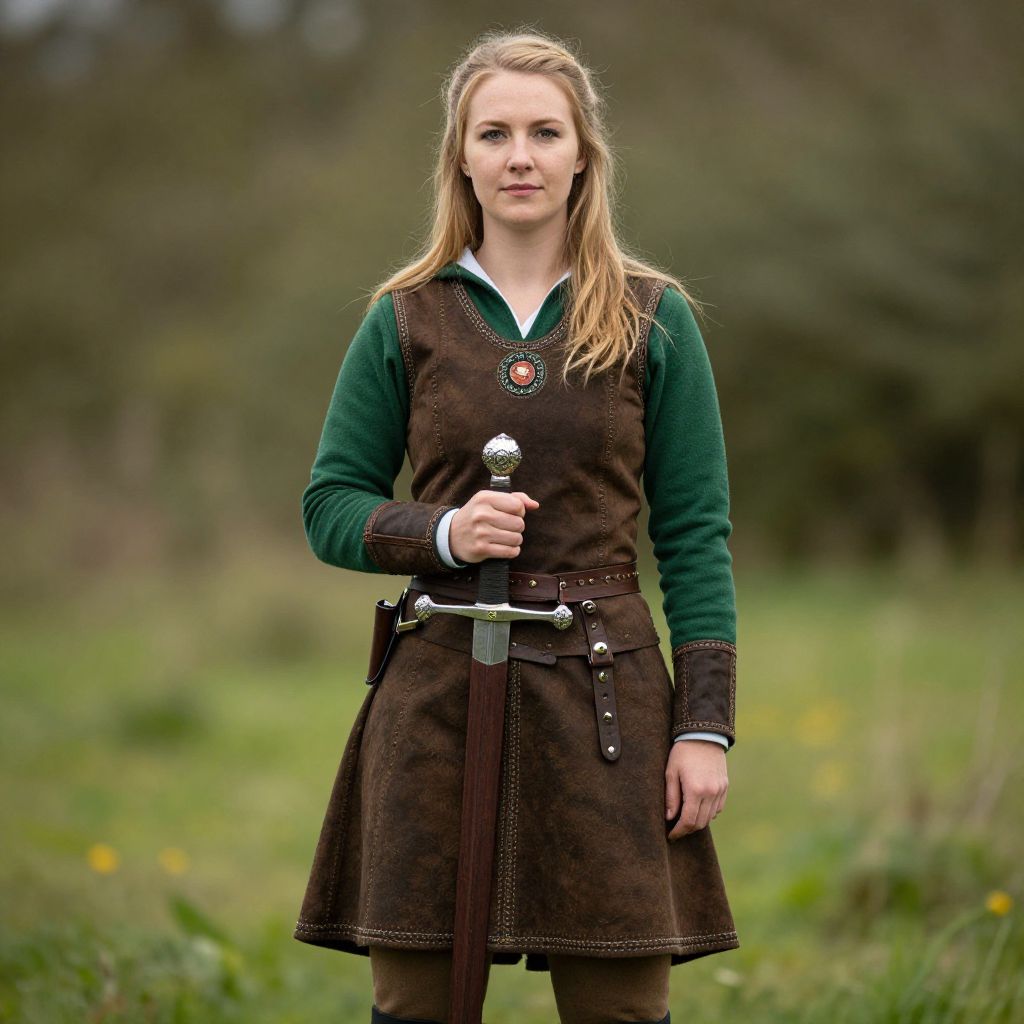 "Sca Irish Garb, woman in a green and brown outfit with a sword"