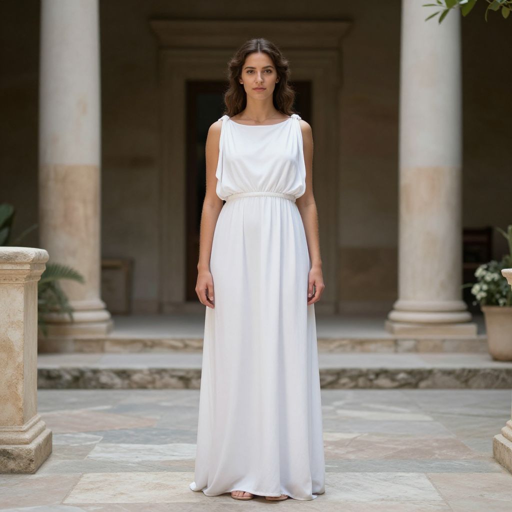 Woman Athenian Goddess Costume, a woman in a white dress standing in a courtyard