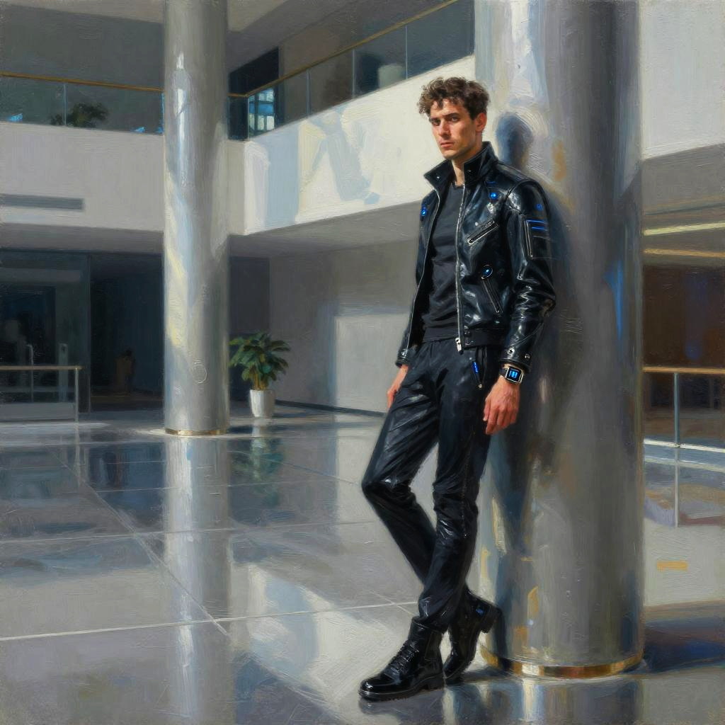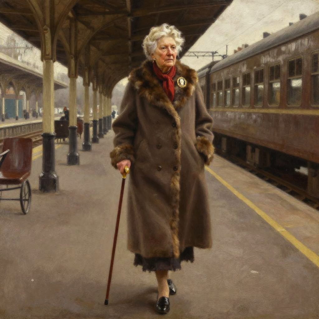 Inside an antique clock workshop. Create an artistic full-length, full-body oil portrait of a woman age 33 in art nouveau style. The image is sepia tinted with splashes of turquoise, flowing ivory silk blouse with high-waisted trousers, standing thoughtfully with one hand adjusting a pocket watch, and ornate brass spectacles. Flowing paint characterizes the work, highly detailed, very high quality