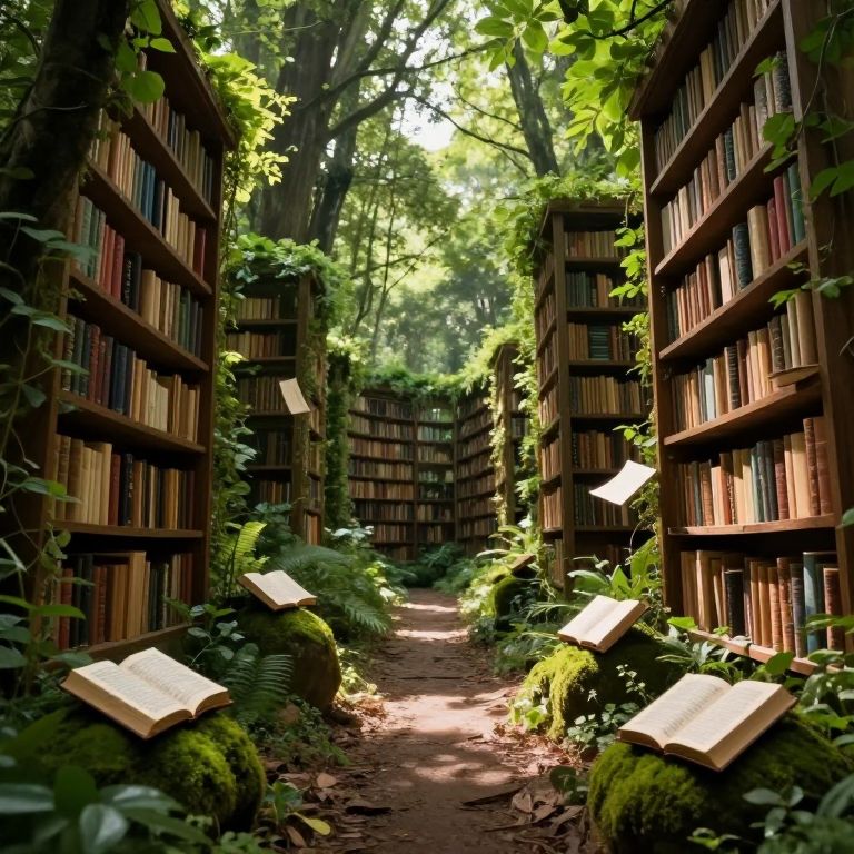 In a surreal digital artwork blending natural and literary elements, an enchanting forest pathway is flanked by towering bookshelves covered in lush greenery, where open books rest on mossy stones, their pages fluttering gently as if whispering ancient tales under the dappled sunlight filtering through the canopy above.