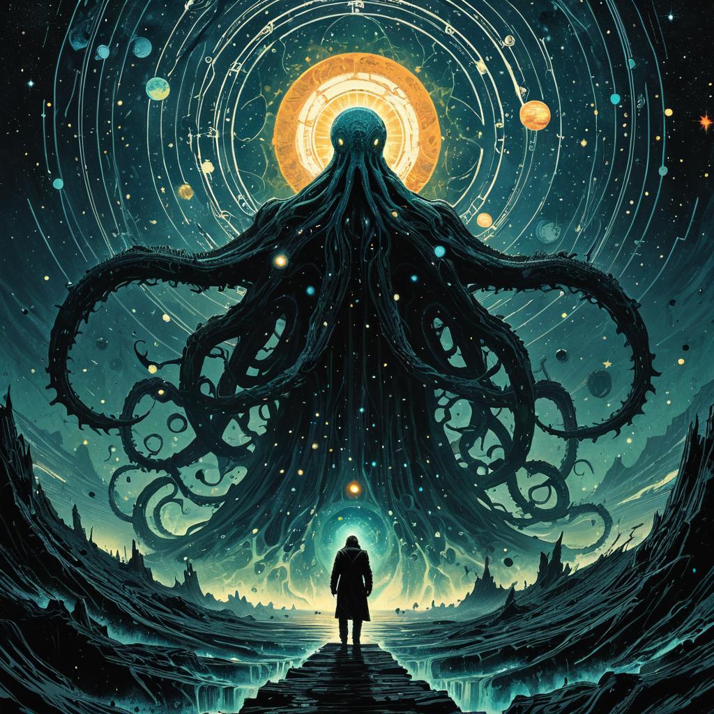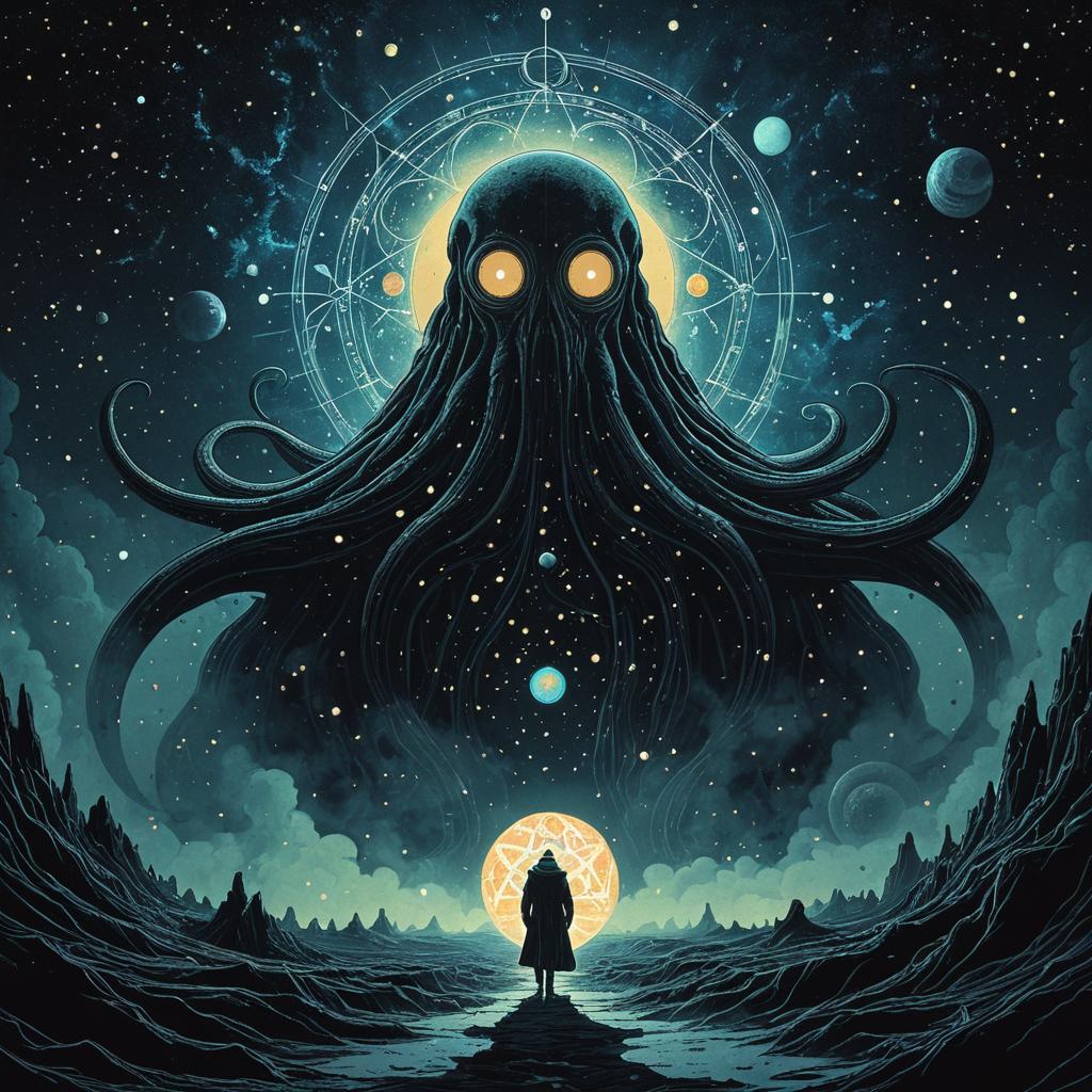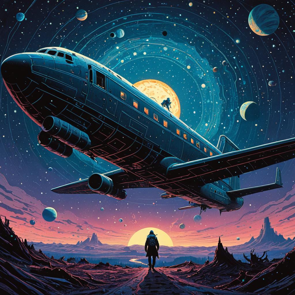 Type Foundry in the style of James Jean, Moebius, Jeremy Mann, and Alphonse. The Ophanim emerging from an abolished plane, lovecraftian aesthetic, galaxy with solar system as background, soft diffused twilight.