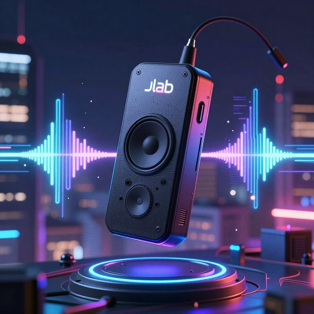 A futuristic jlab audio device floating in neon-lit cyber city at night, surrounded by holographic sound waves and vibrant light trails, synthwave color palette with glowing highlights