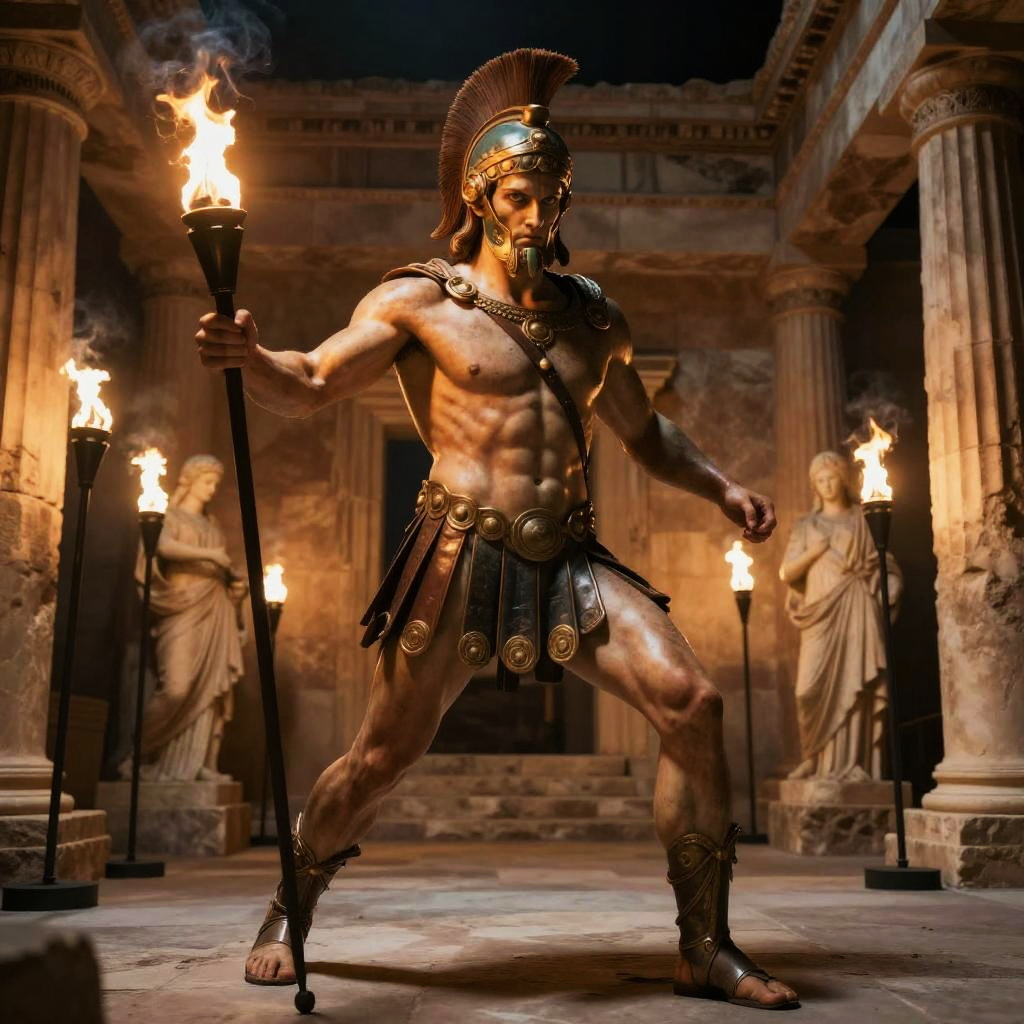 Photorealistic CGI of a muscular, ancient Greek warrior in a dark temple, holding a torch, wearing a helmet and leather skirt, surrounded by lit