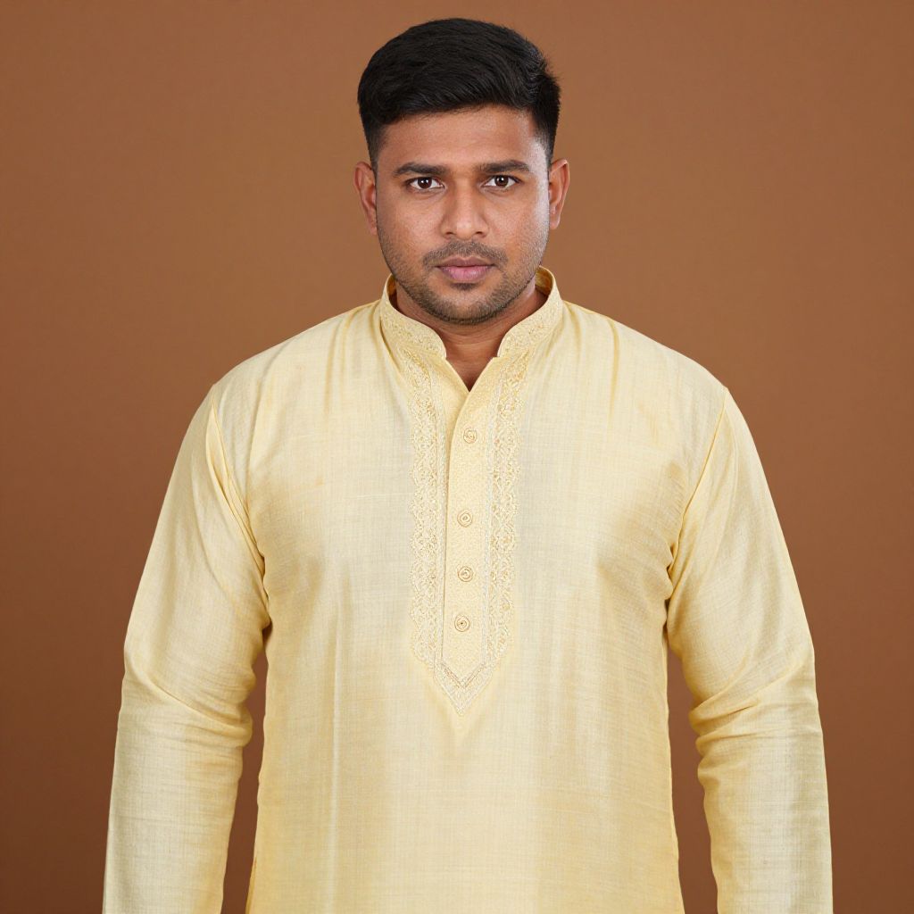 "Traditional Dhoti Kurta Man, a close up of a man in a yellow outfit standing in front of a brown background"