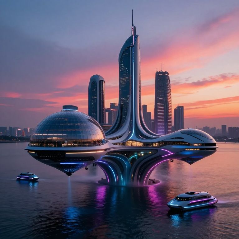 Oart futuristic city floating on water, sleek architecture with glass domes, advanced boats and underwater vehicles, neon lights reflecting on water surface, dusk setting with vibrant sky colors, cyberpunk atmosphere blending nature and technology