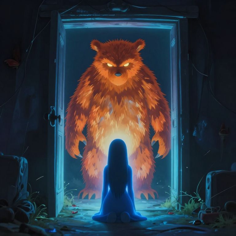 Digital illustration: Silhouetted figure with glowing blue aura faces fiery, menacing bear with glowing eyes in a dark, eerie doorway.