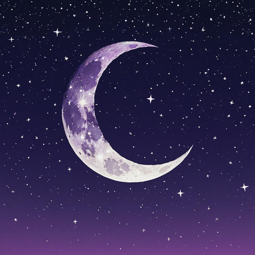 Illustration of a silver crescent moon set against a purple twilight sky filled with scattered stars. The scene features ethereal glows and smooth gradients, creating a serene and romantic atmosphere.