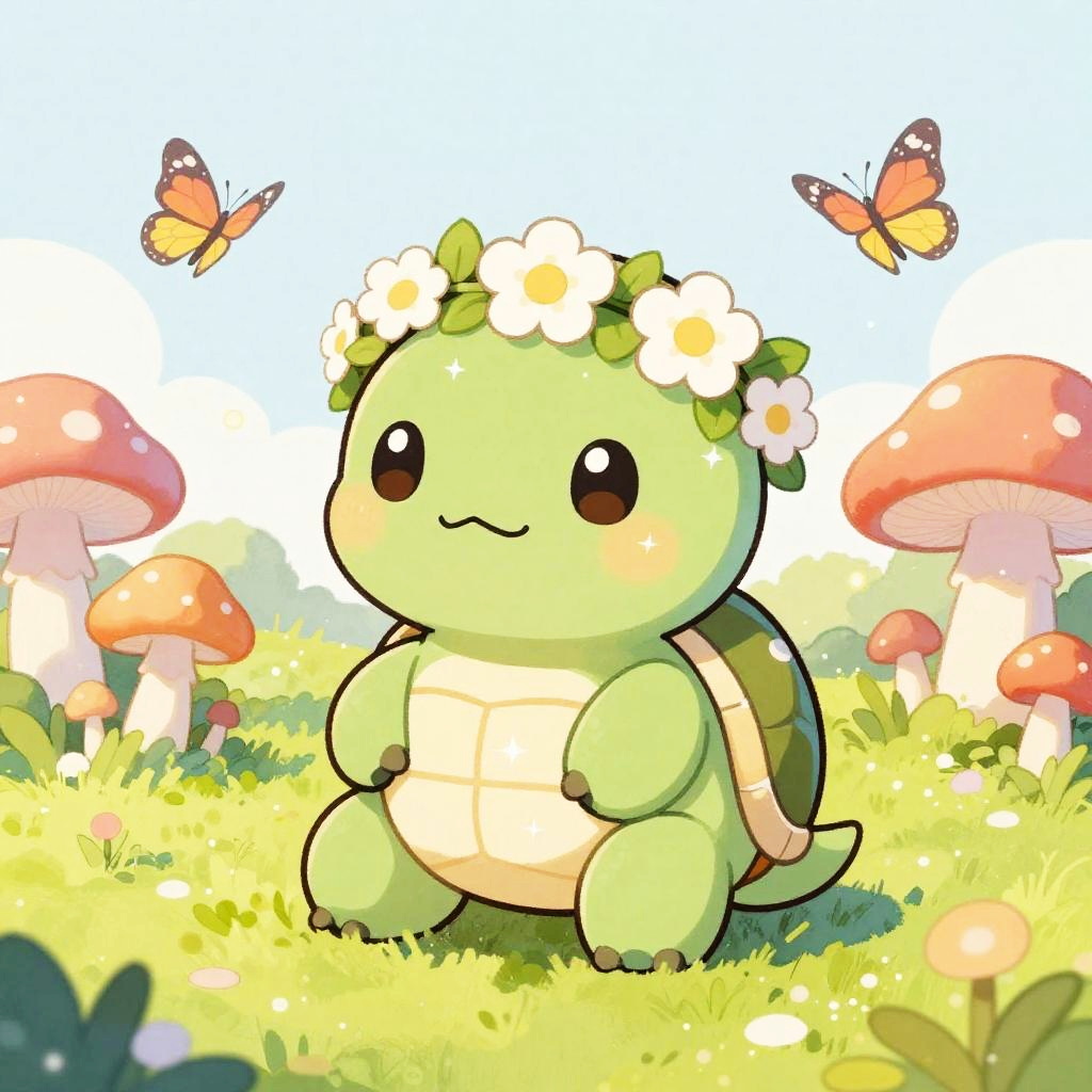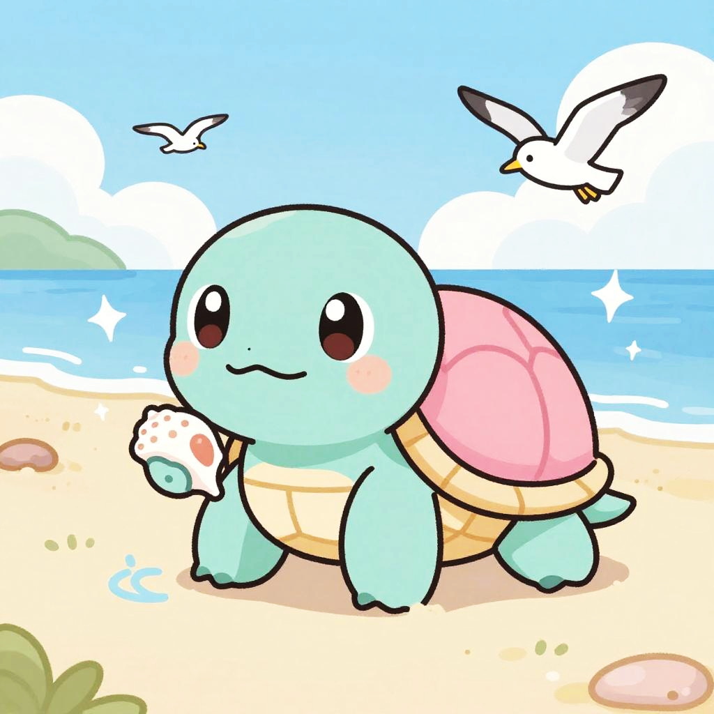Kawaii animated cute turtle crawling on a sandy beach, pastel pink and mint green shell, oversized adorable eyes, holding a tiny seashell, with animated sparkling water and playful seagulls, bright sunny day with a soft cartoon style.