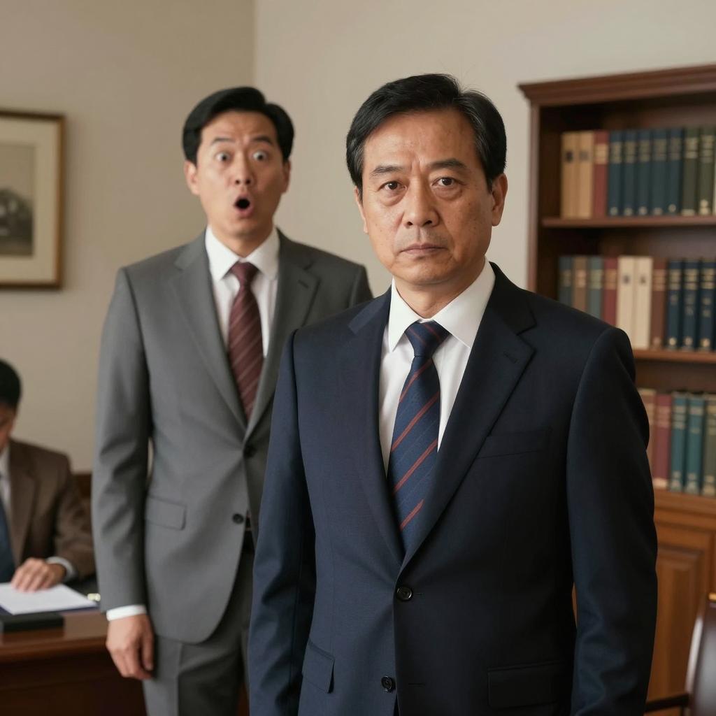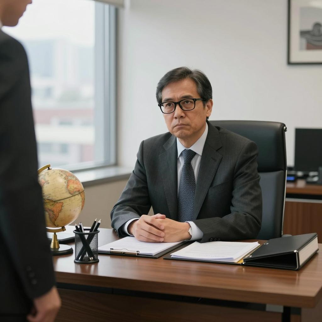 Photograph of a middle-aged man with short dark hair, glasses, and a serious expression, sitting at a wooden office desk. He wears a dark suit, white shirt, and patterned tie. A man in a gray suit stands partially visible on the left. Desk items include a globe, pen holder, black binder, and papers. Office with large windows, cityscape visible outside.
