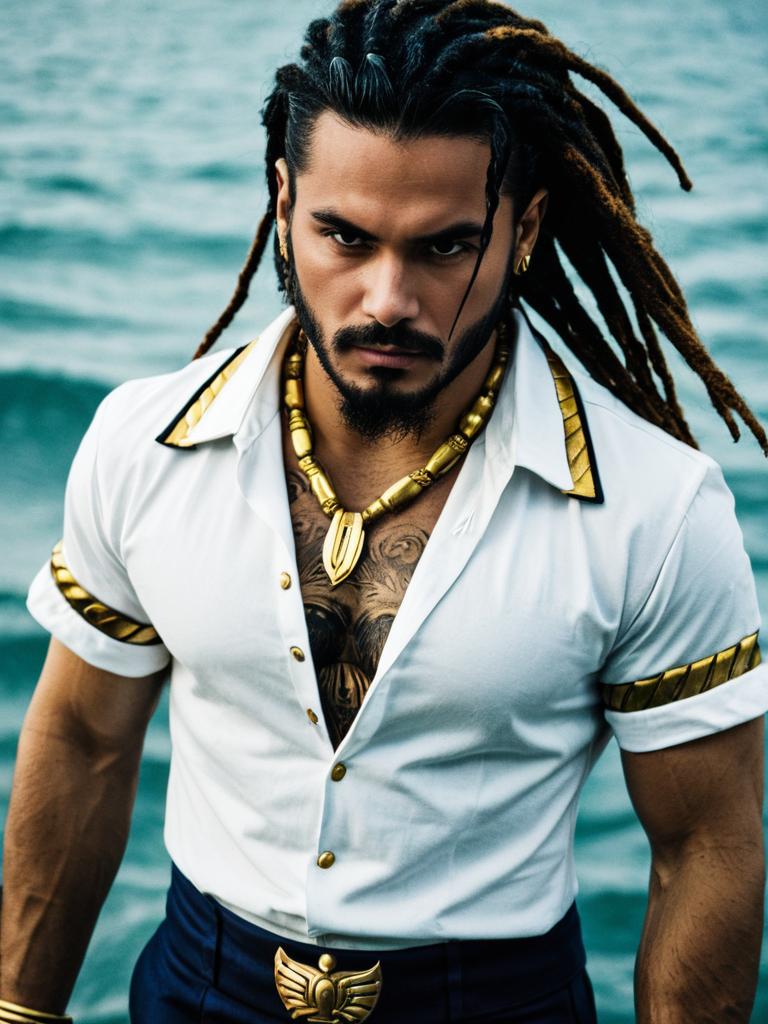 Namor Submariner Costume, man with dreads and a white shirt with gold accents