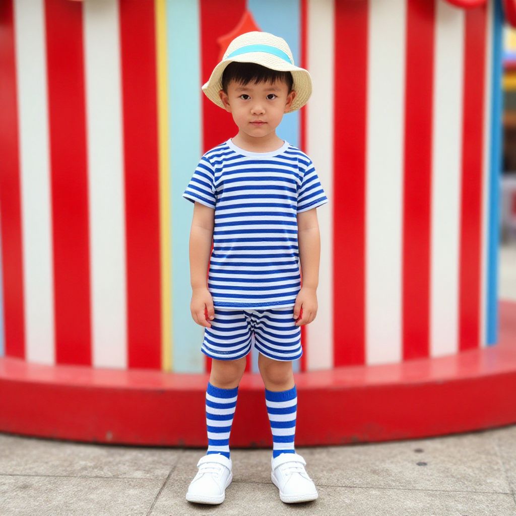 Photorealistic digital image of a young Asian boy standing outdoors. He has short black hair and wears a white sun hat, blue and white striped short-sleeve shirt, matching shorts, and knee-high socks with the same pattern. He also wears white sneakers. The background features a bright red and white striped structure, suggesting a carnival or fair setting. The boy's expression is neutral, and he stands on a concrete pavement. The overall style is vibrant and playful, with a focus on nautical-themed clothing.