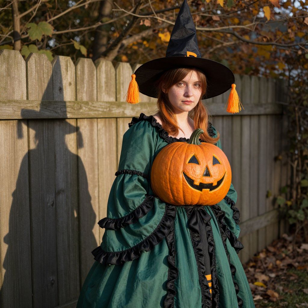 A highly detailed, outdoor portrait of a woman in a full pumpkin patch witch costume — including a long, flowing green dress with black ruffles, a black witch hat with orange tassels, and a pumpkin painted with a smiling face — posing near a wooden fence with fall foliage in the background, the sunlight casting long shadows, her face has a soft, weathered look with a slight blush and a determined expression.. The woman has big tits and cute face