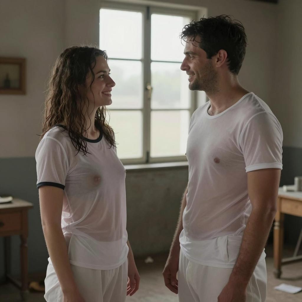 Photograph of two people in a dimly lit, rustic room with a large window in the background. A woman with wet, shoulder-length brown hair and a white, semi-transparent short-sleeved shirt with black trim stands on the left. She smiles at a man with short dark hair, wearing a similar white, semi-transparent shirt and white pants. Both shirts cling to their bodies, revealing their nipples. The man smiles back at her. The room has a wooden and concrete ure, with scattered debris on the floor.