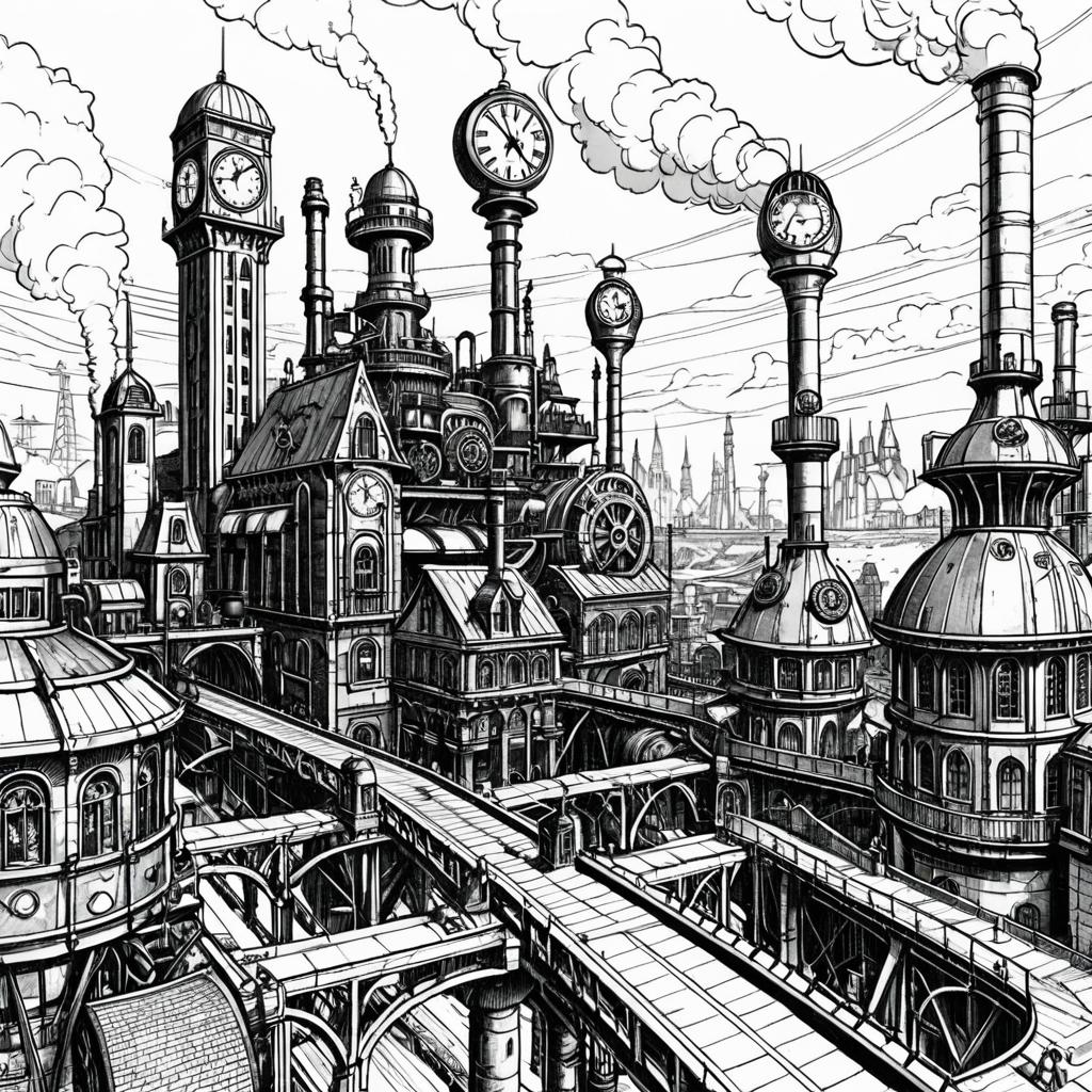 Black and white line art illustration of a detailed steampunk city featuring large clock towers, metallic bridges, and numerous steam vents emitting smoke. The drawing showcases an industrial, futuristic atmosphere with complex architectural designs, interconnected walkways, and towering chimneys typical of a steampunk setting.