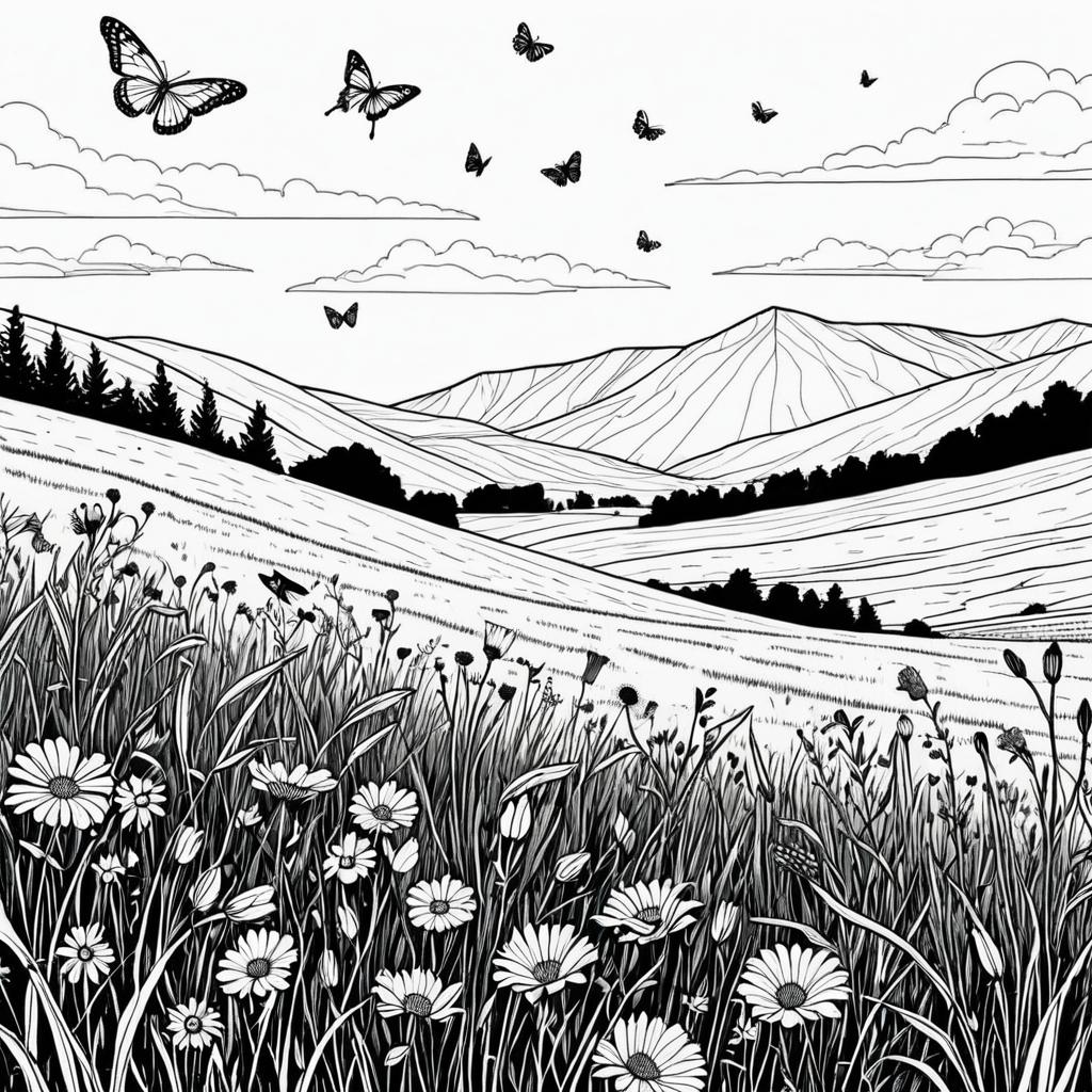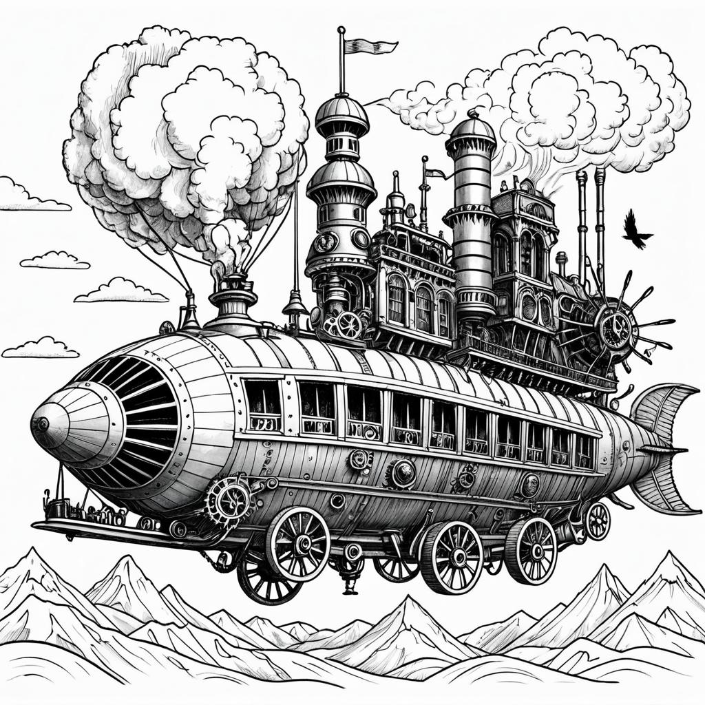 A simple line art coloring page of an adventurous steampunk city with large clock towers, metallic bridges, and steam vents. Includes airships docked near towering chimneys, futuristic atmosphere, detailed line work