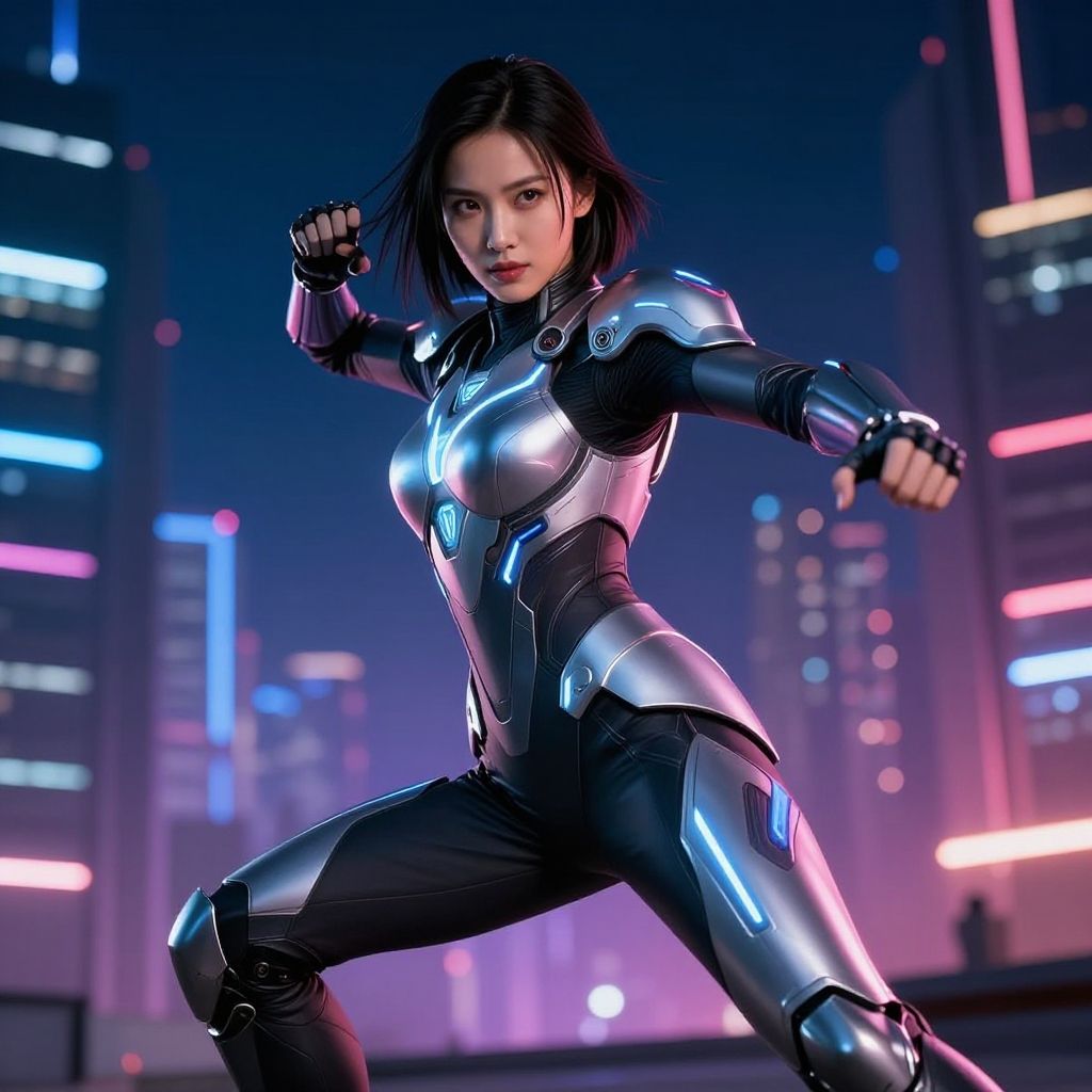 Photorealistic CGI image of an Asian woman with fair skin and black hair in a sleek, futuristic black and silver armored suit. She is in a dynamic fighting stance, fists raised, with a determined expression. The suit has reflective, metallic accents and form-fitting design. The background features a neon-lit cityscape with tall buildings and colorful, glowing lights in blue and pink. The image has a high-tech, sci-fi aesthetic, emphasizing action and strength. The woman's physique is athletic, with a focus on her muscular legs and arms.