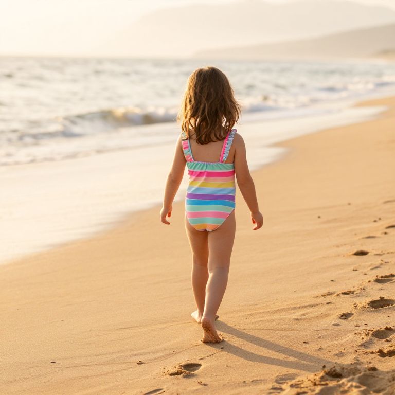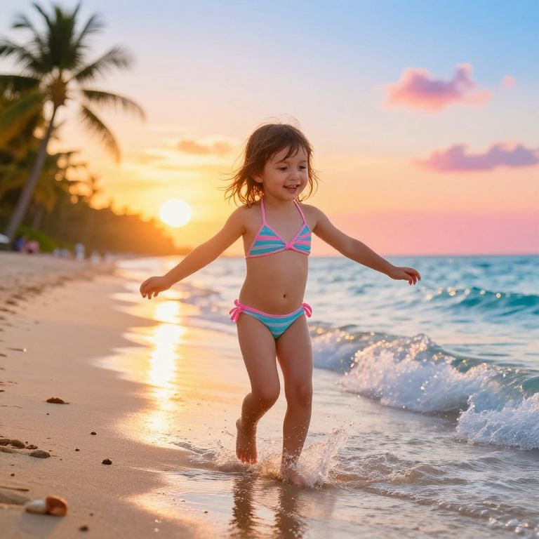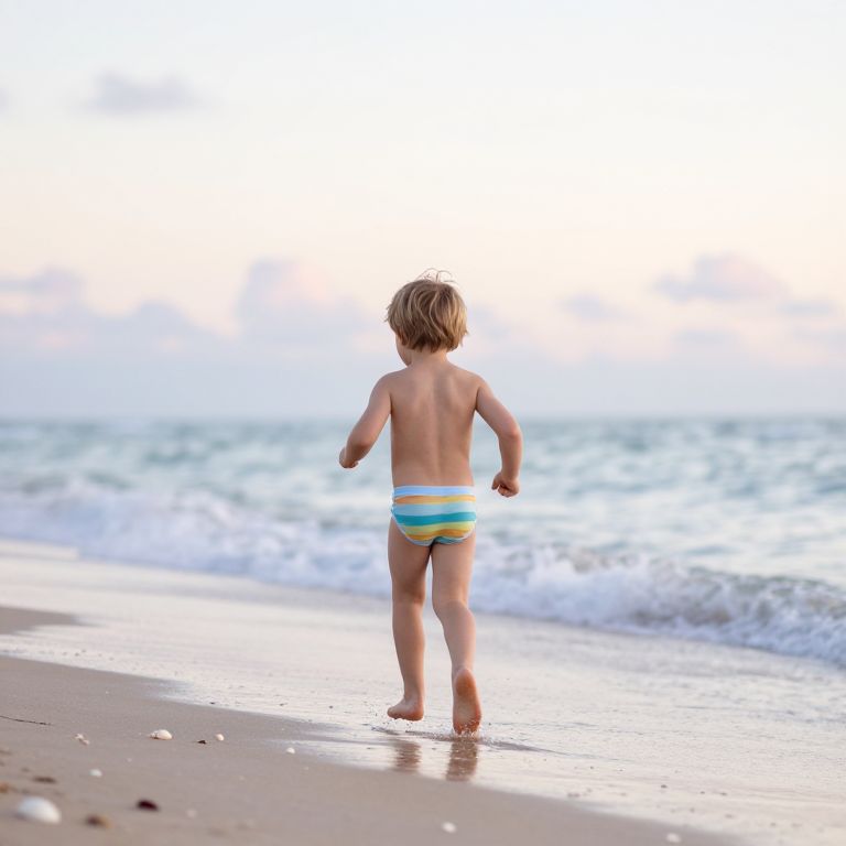 Undies little boy beach, early morning light, small boy running near shoreline, colorful swim trunks, gentle waves and seashells around, soft pastel sky with scattered clouds