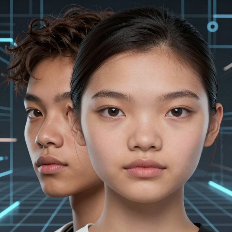 Photograph of two young Asian individuals with light to medium skin tones, standing close together against a dark, grid-patterned digital background with blue neon light accents. The woman in the foreground has straight black hair tied back, large dark eyes, and a neutral expression. The man behind her has curly brown hair and a slightly obscured face, also with a neutral expression. Both have smooth, even skin. The lighting highlights their faces, creating a subtle contrast with the dark background. The image has a modern, high-tech feel.