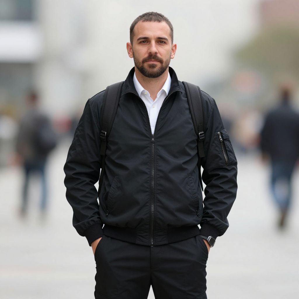 Flight costume, 1boy, male focus, facial hair, solo, outdoors, pants, black jacket, shirt, black pants, blurry background, hands in pockets, blurry, jacket, day, collared shirt, standing, mustache, beard, short hair, white shirt, backpack