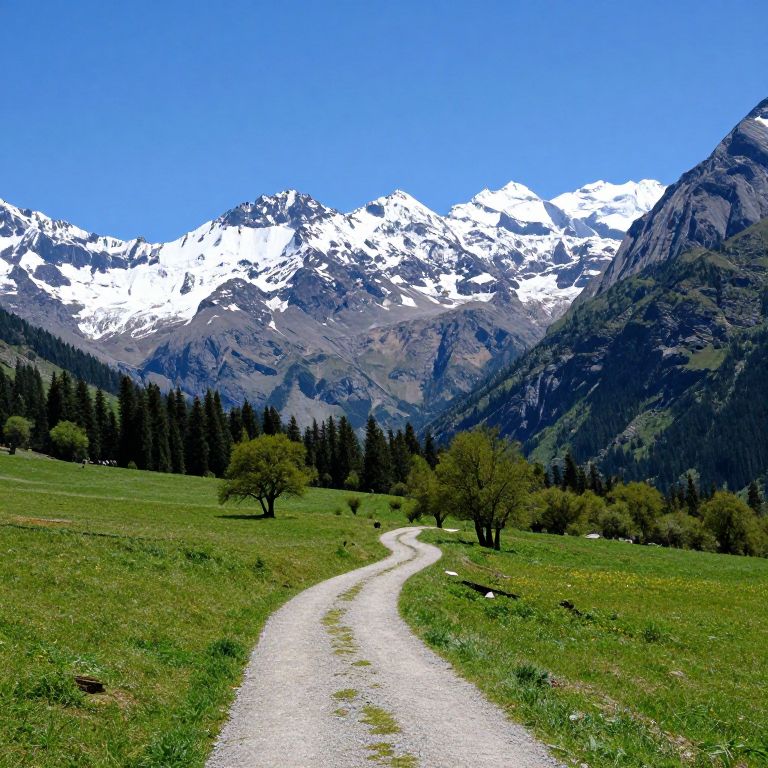 This is a vibrant photograph of a mountainous landscape. The foreground features a narrow, gravel path winding through lush, green meadows dotted with small trees. The midground showcases a dense forest, and the background is dominated by towering, snow-capped mountains under a bright blue sky. The image has a natural, crisp quality, emphasizing the contrast between the green meadows and the white snow.