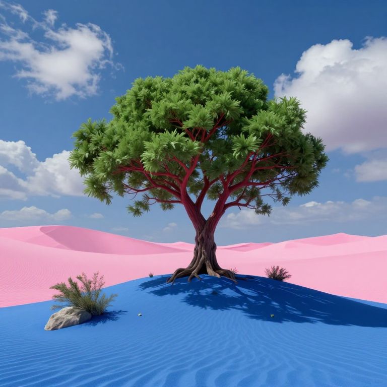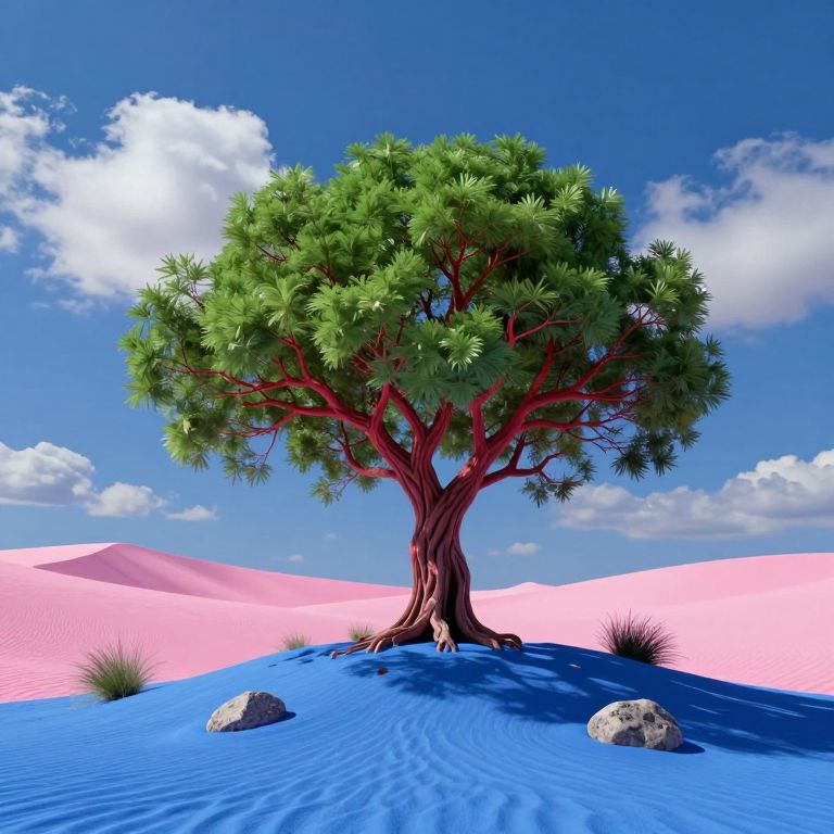 Midjourney art A surreal landscape with a lonely tree on top of a small hill, hight detalisation tree A tree with a dense crown of bright green color, with red branches, grows on blue sand, There are a few rocks and small bushes around, and in the background you can see pink sand dunes that create a sense of calm, fantastic nature, The sky is dark blue, with beautiful vitage white clouds, which adds depth and contrast to the picture