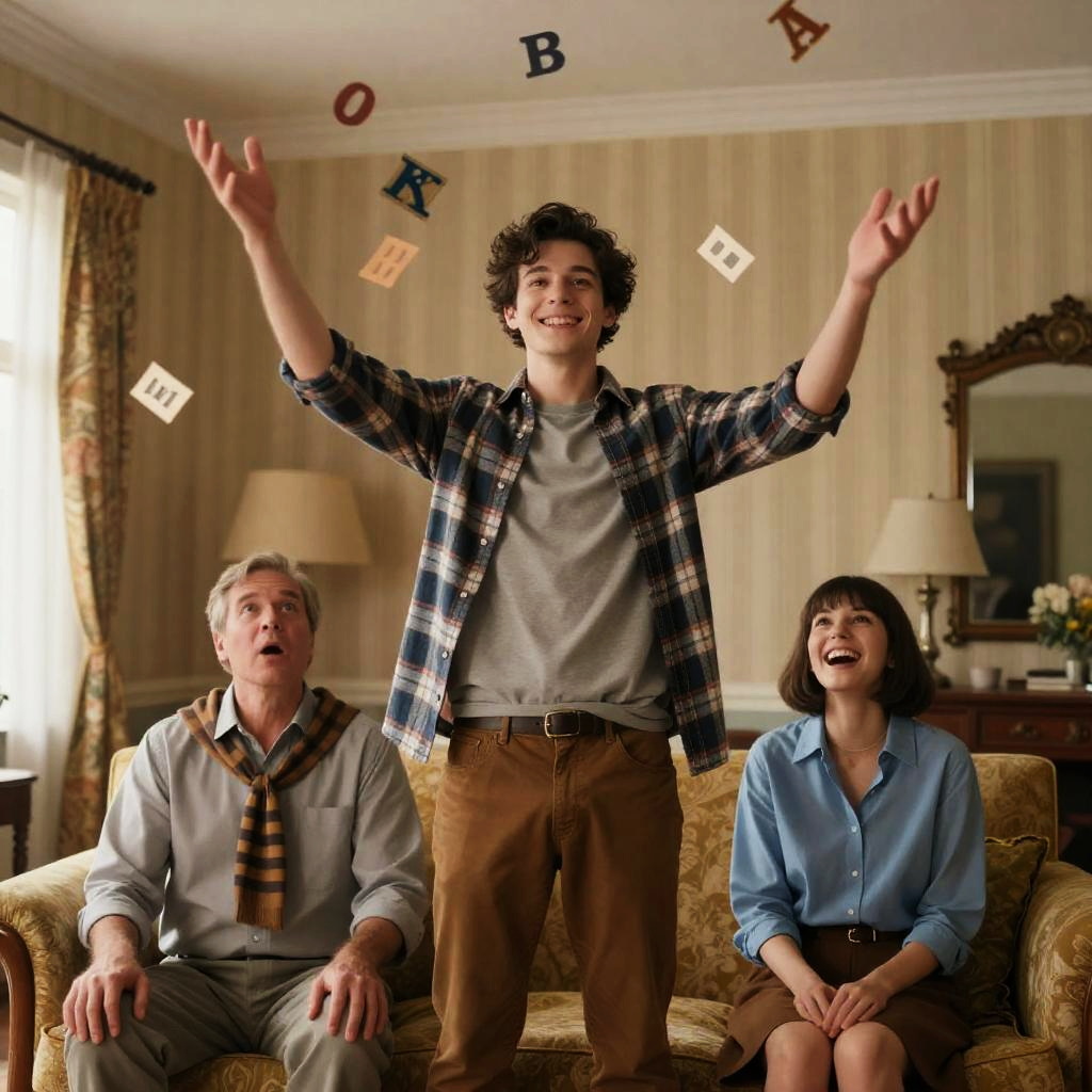 Photograph of three people in a vintage living room. Young man with dark hair, plaid shirt, gray t-shirt, and brown pants stands center, smiling, arms raised, surrounded by flying letters. Middle-aged man with light hair, gray shirt, and striped scarf sits left, surprised. Young woman with short hair, blue shirt, and brown skirt sits right, laughing. Patterned curtains, striped wallpaper, lamp, and mirror in background. Letters mid-air, chaotic motion.