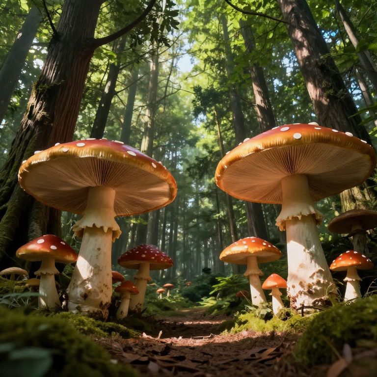 A mesmerizing digital artwork captures an enchanting forest scene with oversized mushrooms and towering trees, reminiscent of surreal landscapes. The camera angle is low, emphasizing the whimsical nature of this environment and evoking a sense of wonderment. Sunlight filters through the lush foliage, casting dappled shadows that add to the dreaminess and mystery, creating an ethereal mood in this captivating tableau styled after Salvador Dali's iconic works.