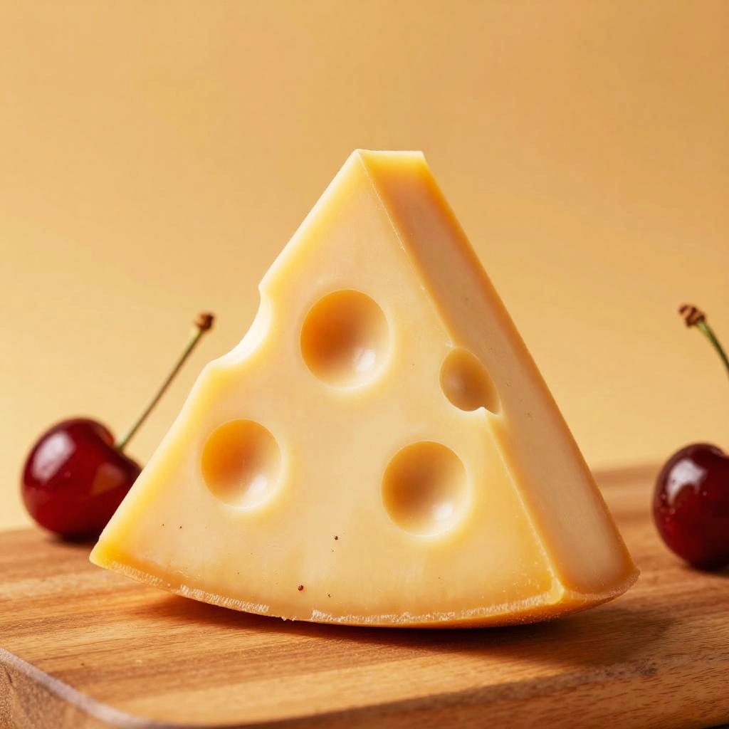 Photograph of a wedge of Swiss cheese with large holes, set on a wooden surface with two cherries in the background.